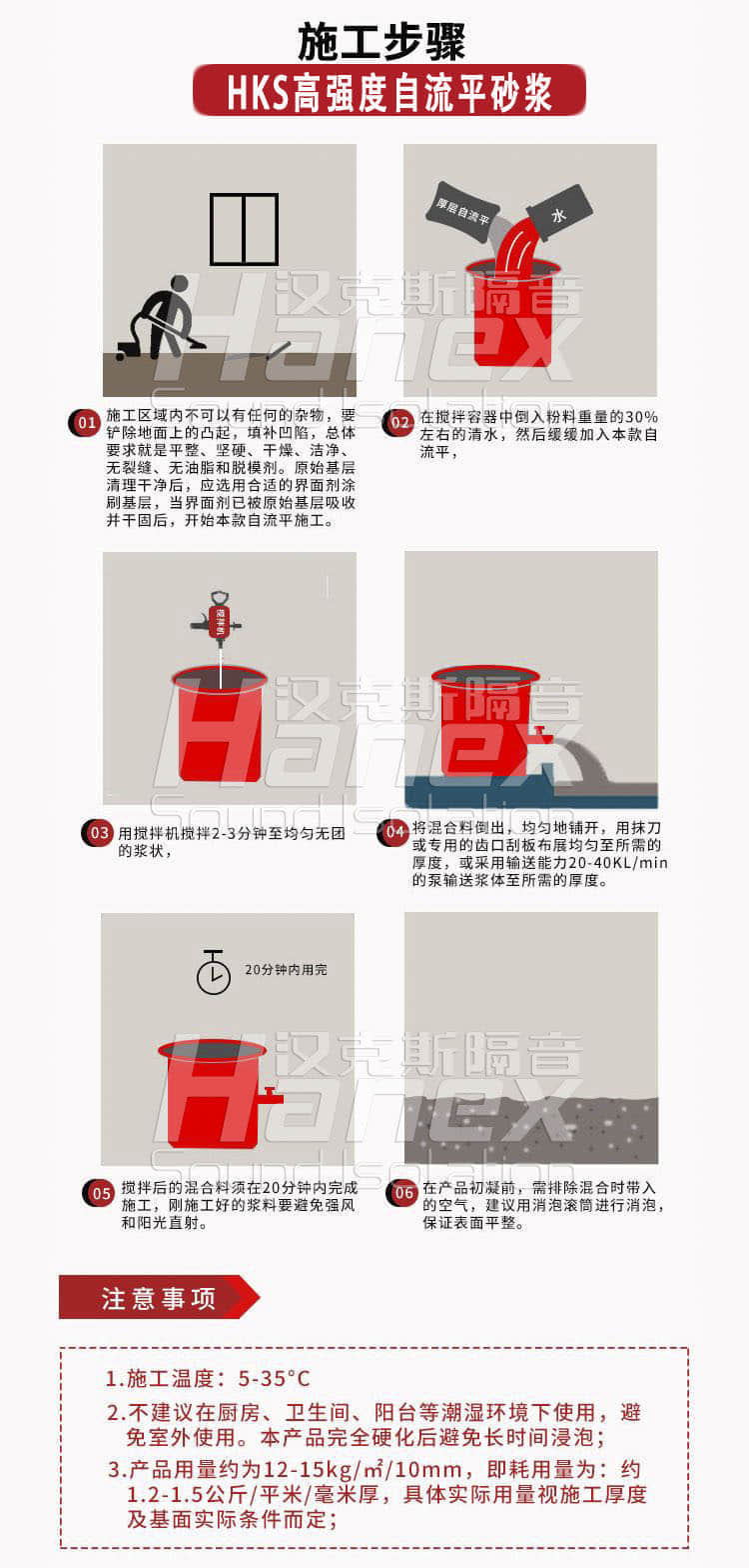 1.自流平砂漿加水量為35+2%,無需添加其他任何成份,先將水放入攪拌桶,再倒入自流平砂漿,用電動攪拌器攪拌2-5分鐘,應(yīng)充分攪拌均勻